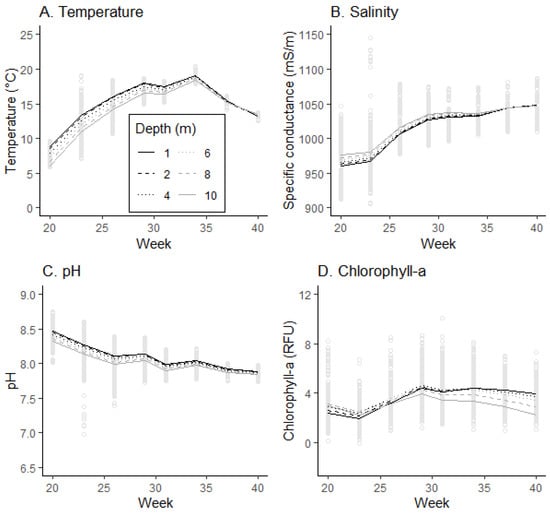 Interactive effects of “week” and “depth” on (A) temperature, (B) salinity (specific conductance), (C) pH and (D) chlorophyll-a concentration based on the observation-level model. See Table 3 for the corresponding model structures and coefficients. All variables are shown on back-transformed scales and observations as grey dots.
