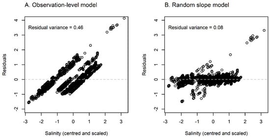 Salinity residual variance in (A) the observation-level model and (B) the random slope model. Note that the variance of the scaled variable is 1.