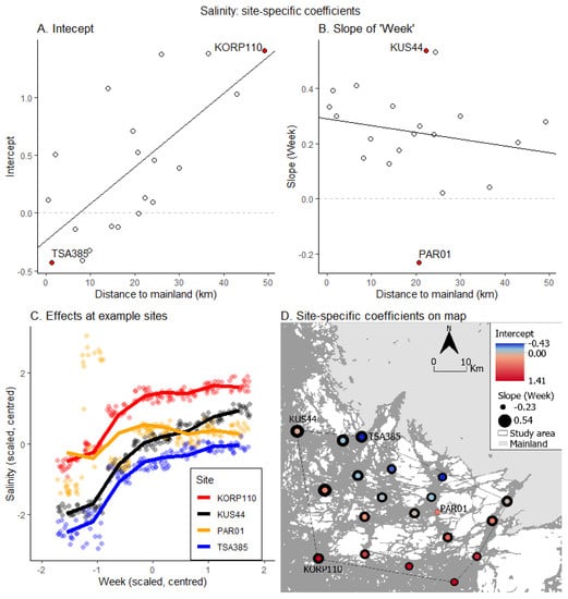 Salinity random coefficients and the partial effect of “week” in the random slope model: (A) site-specific intercepts, (B) site-specific slopes for the first-order term, (C) the main effects of “week” on salinity at four very different sites and (D) coefficients on a map. The four different sites highlighted in the figure are “KORPP110” and “TSA385” with highest and lowest intercepts, respectively, and “KUS44” and “PAR01” with highest and lowest slopes for “week”, respectively. Note that all coefficients and effects are at the scale of scaled and centred variables.