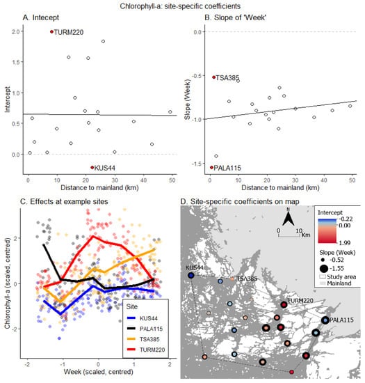Chlorophyll-a random coefficients and the partial effect of “week” in the random slope model: (A) site-specific intercepts, (B) site-specific slopes for the first-order term, (C) the main effects of “week” on chlorophyll-a at four very different sites and (D) coefficients on a map. The four different sites highlighted in the figure are “TURM220” and “KUS44” with highest and lowest intercepts, respectively, and “PALA115” and “TSA385” with most and least inclined slopes for “week”, respectively. Note that all coefficients and effects are at the scale of scaled and centred variables.