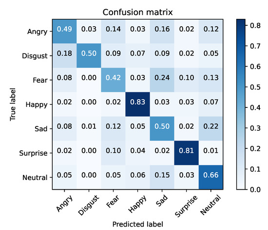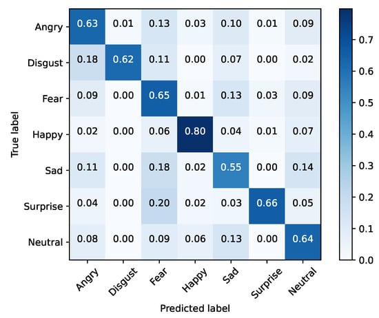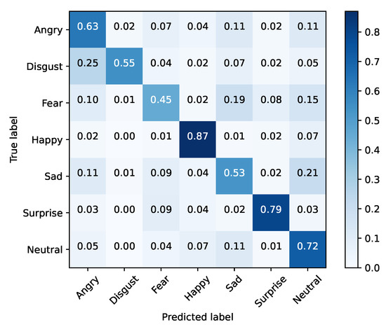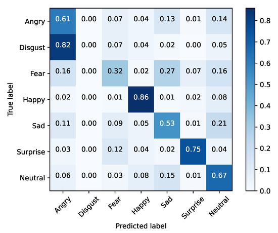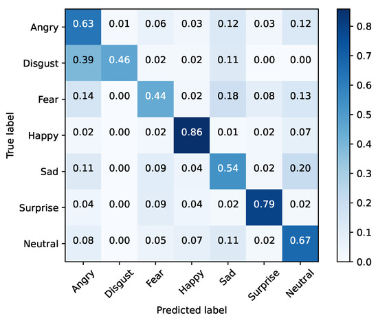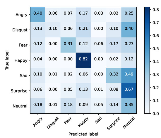 FER2013 was separated into training and testing sets. The baseline models were optimized using cross-entropy and accuracy, for validation purposes, during 25 epochs with a mini batch size of 128. The initial learning rate was set to 0.1, being decreased by a factor of 10% if the validation accuracy did not improve for three epochs. Moreover, the dataset was also extended by applying data augmentation with a probability of 50% on every instance. The selected augmentation methods were horizontal flip and width/height shift (min 10%). Table 5 presents these results for each baseline architecture, while Figure 1, Figure 2, Figure 3, Figure 4, Figure 5 and Figure 6 illustrate their corresponding confusion matrices.