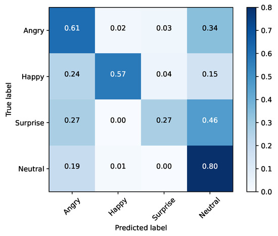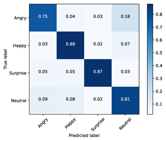 The emotions that stood out in the previous tests were happy, surprise, neutral and angry, achieving a accuracy score of 87%, 80%, 71% and 62%, respectively. When training the model solely with these emotions, it was able to achieve an accuracy of 83%, as shown in Table 8. The confusion matrix for this testing scenario is shown in Figure 9.