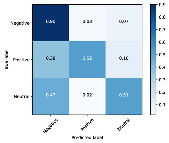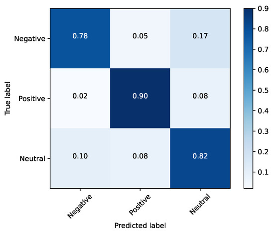 Based on the evidence collected in Section 2.1, there are three clearly demarcated emotional clusters: happy (hereafter titled positive), neutral and a third one composed of the angry, sad, fear and disgust (the emotions with a negative connotation—hereafter titled negative). Therefore, another test involving these three clusters was performed. By concentrating only on these three emotions, the network achieved an accuracy of 85%, as illustrated in Table 8. For this methodology, the confusion matrices for the training and testing sets were illustrated, respectively, in Figure 11 and Figure 12.