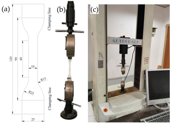 Uniaxial tension test process: (a) uniaxial tension sample size/mm, (b) clamping of specimens, and (c) test machine loading.