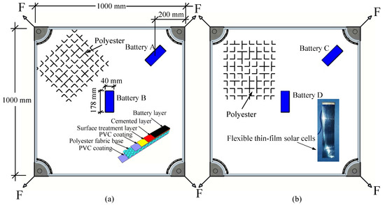 Thin-film batteries (size: 178 × 40 × 0.5 mm; model: amorphous silicon thin-film solar cells on a 0.5 WCel flexible substrate; manufacturer: United-Solar (Michigan, USA), were combined with PVC membranes to form a composite structure, as shown in Figure 2. The technical specifications of thin-film batteries are shown in Table 1. Film batteries were firmly adhered to the center and corner of the PVC membranes using alpha-cyanoacrylate glue so that no relative slip between the membrane batteries and the PVC membranes occurs during tension. Because PVC membranes and thin-film batteries are orthotropic materials, two types of bidirectional loading were designed. One was loaded along the polyester fiber base fabric direction, which corresponds to Battery A and Battery B. Another way is to load at an angle of 45 degrees between the fibers, which corresponds to battery C and D. Three groups of tests were carried out for each loading mode, with six specimens. To prevent edge tearing, edges were treated according to the China Membrane Structure Technical Regulation (CECS158-2015). That is, the boundary of the PVC membrane was folded and thermally combined to form a 60 mm perimeter sheath. Then, the 5 mm diameter side rope was passed through the sheath and around the PVC membrane’s edge. At the corner of the PVC membrane, the specimens were clamped by an arc plate.