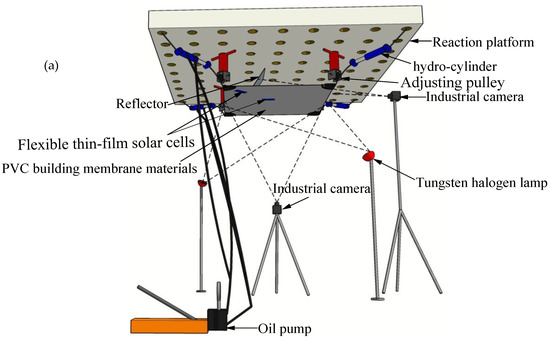 The traditional sticking strain gauge method may be inconvenient to test the battery and membrane’s deformation because of its stiffness. Digital image correlation (DIC) technology [26,27] is based on the grey level of a speckle image. Through a series of calculations of the pixel value, the displacement and deformation of each pixel position will be obtained, and the deformation cloud image will be formed. In this study, an amorphous silicon flexible thin-film battery was attached to the PVC membrane. A new loading device was designed to load the PVC membrane. By adjusting the support’s height, the biaxial tension was not in the same plane, and the composite structure of the saddle-shaped membrane and thin-film battery was obtained. A tungsten halide lamp was used to irradiate the light film battery. The relationship between the deformation of the film and the change of voltage was obtained by DIC technology.
