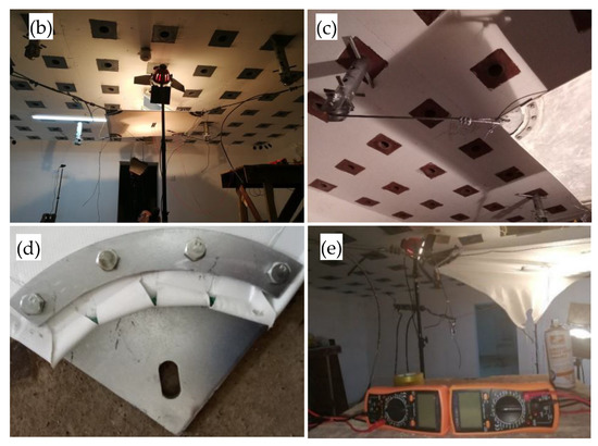 The biaxial loading device of composite structure: (a) three-dimensional schematic diagram of the device, (b) overall test process, (c) pipe and pulley support, (d) connection between steel plate clamp and membrane material, and (e) voltage test device.