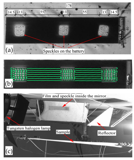 Industrial cameras (Model: 14 megapixels, JHSM1400; Manufacturer: Shenzhen Jinghang Technology Co., Ltd., Shenzhen, China) were set on both sides of the PVC film. The first industrial camera was filmed perpendicular to the battery surface. Due to space location limitations, based on the mirror reflection principle, a plane mirror was placed at the 45-degree angle of PVC film. Then, another industrial camera was used to take pictures of the PVC film inside the reflector, as shown in Figure 4c. During the loading process, the industrial camera was set to take pictures every second. Strain clouds at speckle locations at different loading stages were calculated by using DIC [30,31].