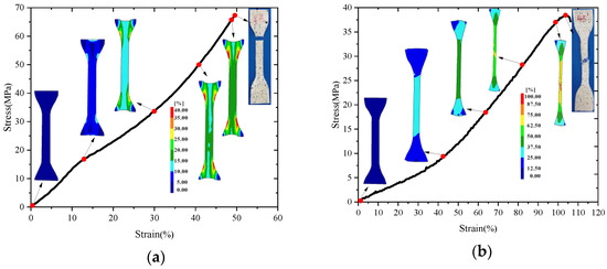For specimens stretched along the fiber direction, the strain cloud pattern is more uniform. Excessive local strain only occurs in the end clamping area. It indicates that the fibers at the cross-section of this sample all bear a high tensile force. For specimens stretched at an angle of 45 degrees along with the fiber, the strain inside the specimens varies unevenly. It indicates a relative slip between the fibers in the membrane, and they were under the combined stress of shear and tension. This loading method results in low tensile strength and high strain of PVC membranes. The above two samples’ strain distributions will further affect the deformation properties of the attached thin-film cells.