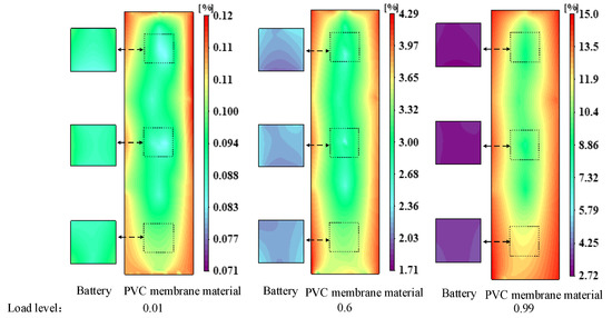 Through the experiment in Figure 3, the corresponding limit loads in Figure 2a,b were 10.52 and 14.61 kN, respectively. The ratio of actual load to ultimate load is defined as the load level. The PVC membrane material at the thin-film battery B and the thin-film battery in Figure 2 is selected for analysis. Strain clouds at different load levels are shown in Figure 6. The general trend of strain clouds for the remaining batteries is similar and will not be repeated here.