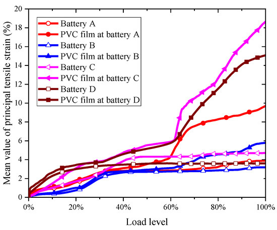 It can be seen from the diagram that the principal tensile strain of all thin-film batteries and PVC membranes increases with increasing load levels. When the load level is less than 0.3, the thin-film battery’s principal tensile strain increases rapidly with the load level increase. Meanwhile, when the load level is more significant than 0.3, they increase again slowly. When the load level is less than 0.6, the strain of PVC film increases slowly. While when the load level is higher than 0.6, the strain of the PVC membrane increases rapidly. When the load level is 0.6, the strain of the PVC membrane at positions A and B of the film cell is about 3%, and at positions C and D of the film cell is about 6%. Simultaneously, only at the edge of the thin film cell, the phenomenon of separating from the PVC film material began to appear. In practical engineering, to ensure that the membrane battery does not disengage from the membrane material during service, the applied load level should be less than 0.6, or the principal tensile strain of the PVC membrane material at the membrane battery should be less than 3%. The saddle-shaped PVC membrane was in a complex stress state in space and usually broke at the four corners first. The strain of the PVC membrane at the membrane cell location was significantly less than that under uniaxial tension. The principal tensile strain of all thin-film batteries shows a similar trend. However, the principal tensile strains of the PVC film at the positions of the thin-film cell C and D are significantly greater than that of the rest. This is because ropes surrounded the saddle-shaped PVC membrane. Compared with the PVC membrane adhering to film batteries A and B, the fibers in the PVC membrane adhering to film batteries C and D were in a more constant tension state and the ultimate strength obtained by experiments was much higher. Therefore, the principal tensile strain of the PVC film at the thin-film batteries C and D was also much more significant at the same load level. Simultaneously, the membrane cell’s principal tensile strain is always smaller than that of the PVC membrane.