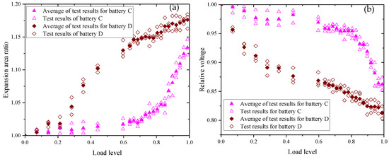 Effect of load level on battery deformation and voltage: (a) expansion area ratio, and (b) relative voltage.