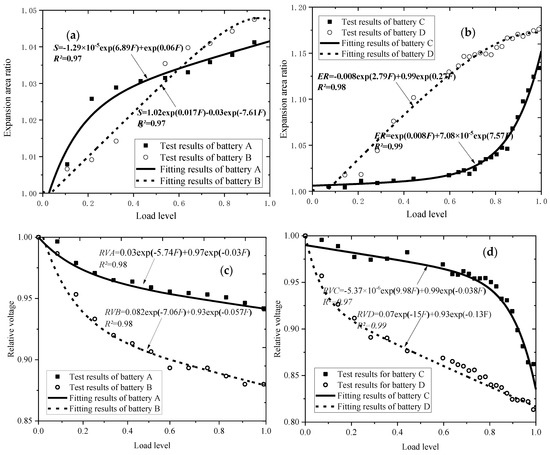 Relationship between expansion area ratio and relative voltage of thin-film cells and load level: (a,b) are expansion area ratio; (c,d) are relative voltage.