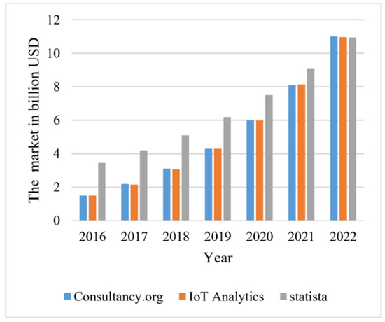 Furthermore, integrating IIoT technologies into PdM-related technologies can effectively increase automated equipment maintenance processes and gain enterprise profits. The combination of IIOT-based PdM technologies is called “IIoT-based PdM”. Figure 3 shows the global PdM-related market sales forecasted by consulting firms. For example, Statista® predicted that PdM-related sales would reach USD 9.1 billion in 2021 [11]. According to a report by Consultancy.org®, the global market sales of PdM-related technologies were USD 6 billion in 2020 [12]. PdM-related technology sales could reach USD 11 billion in 2022, increasing by 83% in two years (2020–2022). According to a report by Consultancy.org®, IoT analytics company reports have a similar prediction trend, i.e., the increase rate from 2020–2024 is up to 83% [12,13]. A report published by MarketsandMarkets™ Comany researches that PdM-related applications will increase and that the PdM market size could reach USD 10.7 billion in 2024 [14]. Investment is increasing in PdM-related applications, IoT-related applications, artificial intelligence techniques, and ML technologies [14]. Most IoT vendors integrate data analytics technologies and data communication to develop IIoT-based PdM applications. For example, Microsoft Azure, IBM Watson, and Amazon Web Service (Seattle, WA, USA) provide data storage, IoT gateway, ML module, and other services for PdM manufacturing. These major factors may contribute to the PdM-related market growth during the forecast period. IIoT-based PdM vendors focus on cloud- and edge-based predictive analytics. The present study predicts the semiconductor and blister packing machine cases using the ML algorithm in data analytics.