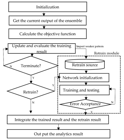 This study improves the boosted decision tree using a retraining mechanism, and the weak pattern from the training data source that should be corrected. The retraining mechanism improves computational performance by expanding the solution space for the weaker pattern to explore. This study used neural networks to retrain the weaker pattern data source from the trained boosted decision tree model. The framework of the neural networks comprised the input, hidden, and output layers. Figure 4 depicts the flowchart of the proposed method. The input patterns were fed forward to the net’s input layer as the training began. The patterns feedforward to hidden layers that are the intermediate layers between the input and output layers and where all computation occurs. This pattern is fed forward to the output layer. The computed error is estimated in the output layer by comparing the difference between the output result and target.