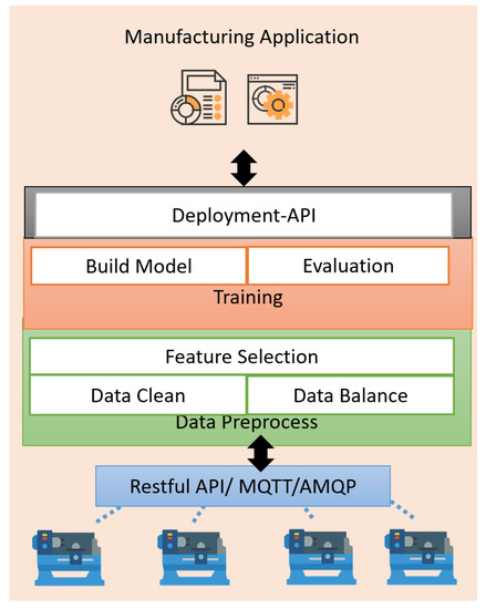 Transmission data streams between edge-side equipment and cloud-side communications play an essential role in IIoT advancements [2]. This study represents the use of data analytics in the manufacturing process. However, model deployment is a significant stage in the data analytics procedure. The trained model can be deployed as API, which allows a user to send a service request with an API key, and the server side can respond to the request with a prediction. The API can be used in an edge-side platform to form edge-based analytics. Edge-based analytics provides computing resources for applications with networking close to the edge-side (e.g., factory floors and end-users). In contrast, the fog-based framework lies between the edge and cloud. Fog-based analytics facilitates computing operations, providing connectivity between the edge-side and cloud-based platforms. Related studies have used fog computing in the predictive maintenance problem [44]. The sustainable development of IIoT-based PdM applications is crucial for smart manufacturing; thus, configurable API use may co-create the value for manufacturing maintenance. Herein, the trained model is deployed as an API that can be used in edge-, fog-, and cloud-based analytics for flexible use (see Figure 10).