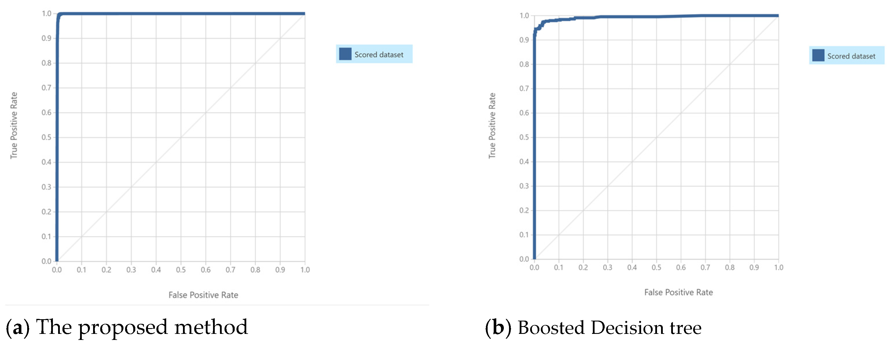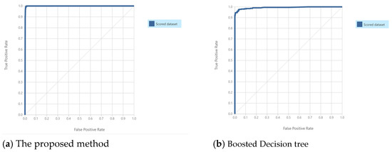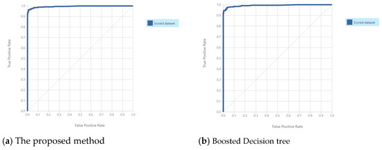 We used the preprocessed data to predict yield failure in the semiconductor manufacturing process (Table 5). An accuracy and recall rate of 0.974 and 0.957, respectively, were obtained using the proposed method. The boosted decision tree had an accuracy and recall rate of 0.966 and 0.945, respectively. Recall rate is the measure for how many true anomaly instances are predicted out of all the anomalies in the dataset; the result showed that the proposed method has higher accuracy and recall rate than the other algorithm. The proposed method outperformed the boosted decision tree and decision tree. Thus, compared with the decision tree, ensemble learning exhibits better prediction performance than the decision tree. Figure 7 shows the ROC of the proposed method and boosted decision tree algorithms. The AUC of the proposed method is 99.5% and that of the boosted decision tree is 99.4%. All ensemble methods achieved an AUC greater than 0.9; the result represents the better performance of the proposed method and the ELAs at distinguishing between the binary classes issue.