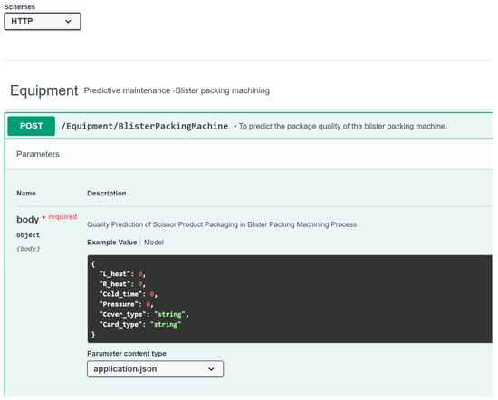 In summary, the result obtained using the proposed method was compared with that of the boosted decision tree and decision tree. Furthermore, the obtained result indicates that the ELA achieves more than 95% accuracy in both the semiconductor case and the blister packing machine case. The proposed method outperformed the single learning method in the two cases. The trained model was deployed as a RESTful API and WS, which can be used in edge- or cloud-based analytics for predictive maintenance manufacturing. The data analytics process is fully automated after sending the analytics requirement to the server side via the API. The submission is detected by the server-side process and automatically mapped to a calculation workflow that specifies the task type (e.g., preprocessing, ML training module) according to the API message. The server-side response to the analytics result equipment data can be imported to the cloud platform to improve textile quality by predicting equipment settings. This study uses Python to develop the proposed PdM APIs based on the REpresentational State Transfer (REST) pattern for the web. The RESTful APIs use commands to obtain resources. The state of a resource at any given timestamp is called a resource representation. RESTful APIs have different execution types: “GET”, “PUT”, “POST”, and “DELETE”. GET is used to retrieve information; PUT is used to transmit information, change the state of or update information; POST is used to transmit information and create a resource; and DELETE is used to delete information. This study proposed managing APIs through the Swagger platform. In this study, the PdM APIs enable users to directly access the trained model via the Hypertext Transfer Protocol (HTTP) and provide an efficient way for users to programmatically query analytics instead of relying on browser-based interfaces. A user can send an API request through the media type of HTTP and respond to information in the typical API design. In this study, we consistently use the JSON format as the API response format, and this has been widely used in web or mobile applications (see Figure 9).