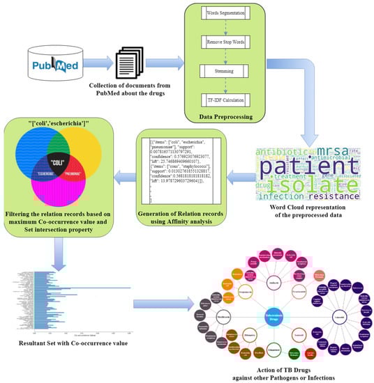 This article proposes a TREASURE framework, that follows affinity analysis to find various relations between the dataset and filters out the patterns among these records via set intersection and occurring frequency. Algorithm 1 gives the outline of the TREASURE model. Thousands of documents pertaining to each drug are collected from the PubMed database. The collected documents are preprocessed as they undergo tokenizing, stemming, stop words removal and tf-idf calculation phases. The preprocessed data are visualized through word cloud to give an idea about the frequently occurring words in the collected dataset. Then, the preprocessed data undergoes an affinity analysis phase, which determines various co-occurring relationships among the words in the dataset and generates the relation records accordingly. These relation records are then filtered, based on maximum co-occurrence value and set intersection property, to obtain the resultant set. Thus, different resultant sets for different TB drugs are obtained and are then analyzed to provide various inferences. The overall architecture of the TREASURE framework is depicted in Figure 1.