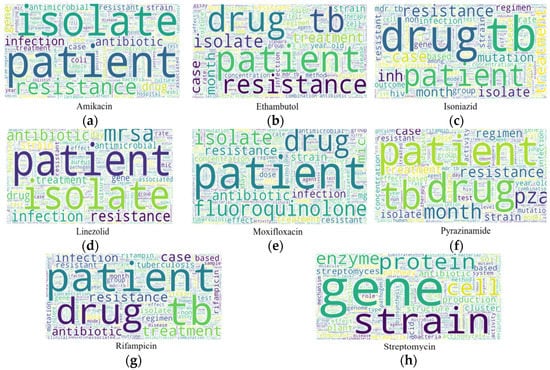 Word clouds for TB drugs: (a) Amikacin, (b) Ethambutol, (c) Isoniazid, (d) Linezolid, (e) Moxifloxacin, (f) Pyrazinamide, (g) Rifampicin, (h) Streptomycin.