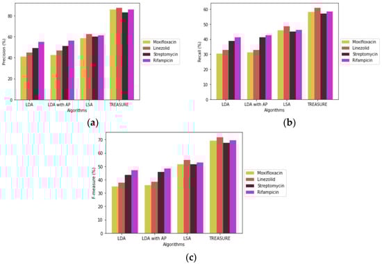The above mentioned standard methodologies are calculated for various algorithms. The graphical comparisons of these measures for four different drug datasets, moxifloxacin, linezolid, streptomycin and rifampicin are depicted in Figure 6a–c. From Figure 6c, we can observe that the TREASURE model gives high accuracy (71.85%) when compared to LDA, LDA with AP and LSA algorithms. The benchmark words for comparing the results of each algorithm were collected from renowned information sources such as WHO, Healthline, MEDLINE and NIH. Hence, it is evident that this way of data extraction has provided appropriate results in the identification of various TB drug–pathogen relationships.