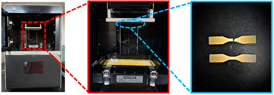 The treated resin mixtures were poured directly onto a private vat made of a transparent Teflon film. Dog-bone and Izod-notched composite specimens were 3D-printed using an Ultra-125 DLP 3D printer (MiiCraft Corp., Hsinchu, Taiwan) for characterization. The 3D printing parameters are shown in Table 3. The printed specimens were first washed with tap water to remove residual resin, and then they were washed twice with ethanol to clean the surface. Subsequently, before analysis, the samples were stored in a place without sunlight or fluorescent light to prevent over-curing. Mechanical tests were performed 2 days after printing to allow the stabilization of the polymer cured by photo-polymerization reaction. The pictures of DLP 3D printer (exterior and interior photos) and 3D-printed composites are shown in Figure 2.