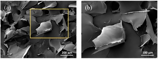 SEM images of lyophilized CNCs processed at a high concentration: (a) ×100 and (b) ×200.