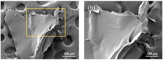 SEM images of 1.0 wt% CNC/photopolymer composites processed at a high CNC lyophilization concentration: (a) ×100 and (b) ×1000.