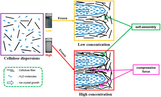 The SEM images showed that the morphology of the CNC powder, which was obtained by lyophilization processes, was a large-sized agglomerate at low and high concentrations (Figure 3 and Figure 4). Cellulose nanocrystals with nanoscale units have a very large specific surface area and high surface energy, resulting in CNC self-agglomerations during processing [31]. Also, in the rapid-freezing process of CNC suspension, water quickly releases heat and solidifies to a crystalline state at −80 °C. In this process, the molecular arrangement of water forms ice crystals, and the growth direction of ice crystals goes from the outside of the container to the inside. This is consistent with the previous findings that as the crystals grow, the arrangement of water molecules in the vessel changes, the volume of the solvent expands, and subsequently, the CNCs suspended in the solvent are subject to compressive stress due to the volume expansion of the surrounding ice crystal growth [32]. The CNCs are then aligned in the chiral-nematic phase, forming and concentrating lamellae. As a result, CNC lamellae bundles are formed by the self-aggregations of CNCs and the compressive stresses generated during cryogenic freezing. Figure 5 shows a schematic diagram of the above-described mechanism.