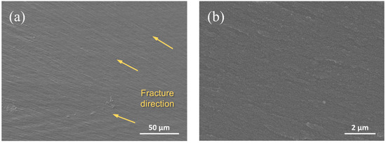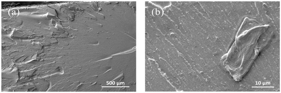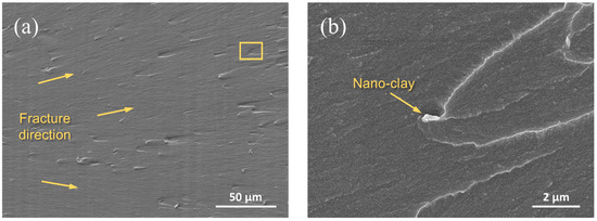 SEM images of a composite filled with 0.25 wt% nanoclay: (a) ×500 and (b) ×10,000.