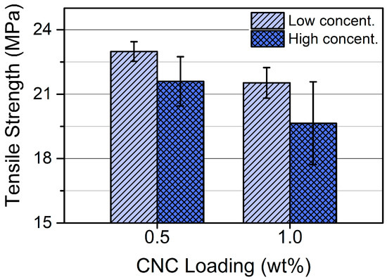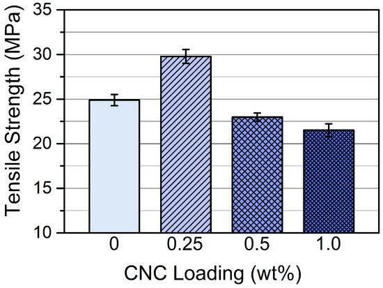 Tensile strength of CNC/photopolymer composites with various CNC loading levels.