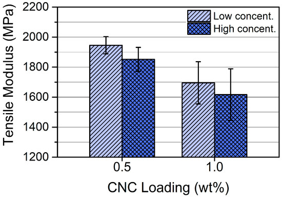 Tensile modulus of CNC/photopolymer composites with various CNC loading levels.