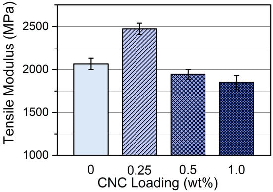 The tensile strength of 0.25 wt% CNC/photopolymer composite was 30 MPa, indicating a 20% increase in tensile strength compared to the photopolymer composite without CNC particles (Figure 12). However, the incorporation of more than 0.25 wt% of CNCs did not show an improvement in tensile strength of the composites, but rather reduced the strength values. The tensile modulus of 0.25 wt% CNC/photopolymer composite was 2474 MPa, and it had 20% higher tensile modulus than the neat photopolymer composite (Figure 13). However, CNC/photopolymer composites with higher CNC loading levels (i.e., 0.5 and 1.0 wt%) showed lower tensile modulus values compared to the neat photopolymer composite, resulting in 5.7% and 10.3% reductions in modulus values, respectively.