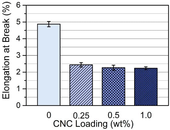 Elongation at break of CNC/photopolymer composites with various CNC loading levels.