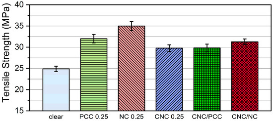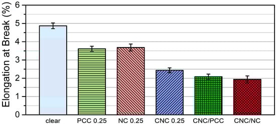 For the elongation at break (Figure 18), the composites with inorganic nanofillers showed lower values than the pure resin composites because the inorganic nanofillers gave the composites rigidity and reduced ductility. In addition, voids were generated around the evenly distributed inorganic particles in the composites during the tensile test, and they had a negative effect on the elongation of the composites [38]. Moreover, with the addition of CNC particles, this trend was exacerbated, resulting in a 50% reduction in elongation at break compared to pure resin.