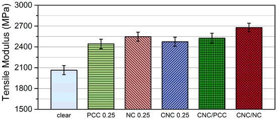 Tensile modulus of composites filled with CNC and/or inorganic nanofillers.