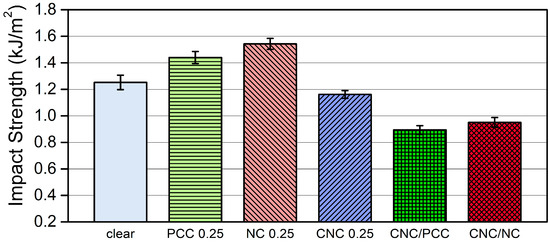 Impact strength also showed toughening effects by inorganic nanofillers, resulting in strength improvements of about 15% for nano-PCC and about 23% for nanoclay (Figure 19) [39]. Composites with CNCs had lower impact strength values compared to the composites with inorganic nanofiller only. The addition of CNC particles to the photopolymer resin negatively affected the impact strength value of the composite. Impact strength is the capability of a material to withstand a suddenly applied load, and it is expressed in terms of energy. In the case of the composites filled with CNCs, the CNCs act as impurities in the composite matrix, and sudden strong loads are concentrated on the CNCs, causing instantaneous fracture and weakened impact resistance. Additionally, when the CNCs are added to the photopolymer resin with inorganic nanofillers, the ductility of the composites is further lowered. Therefore, the stress concentration by CNC particles is accelerated, and the impact strength is accordingly decreased.