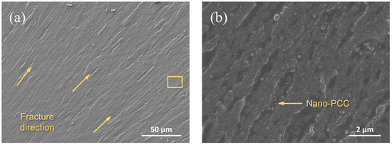 SEM images of a composite filled with 0.25 wt% nano-PCC: (a) ×500 and (b) ×10,000.