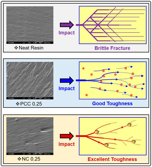 Also, compared to the composite with nano-PCC, the fracture features of the composite with nanoclay were wider and shorter. The fracture failure patterns described above may explain the stress transfer mechanism mentioned in the mechanical properties. For the composite with nano-PCC, when the stress was transferred to individual cubic-like nano-PCC particles, appropriate loads were transferred to the nano-PCC particles, and the residual loads were turned sideways so that stress transfers developed in the original fracture propagation orientations. However, nanoclays have wider high-aspect-ratio layers to accommodate the transmitted stresses, which prevent the straight development of fractures. Thus, the nanoclays could accommodate large stresses and the stresses might be dissipated in composites. As shown in Figure 23, the different stress transfer mechanism models of these inorganic nanofillers provide a supporting basis for the mechanical strength values evaluated in this study.