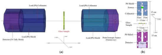 MCNPX setup: (a) 3D view of gamma-ray transmission setup obtained from MCNPX Visual Editor; (b) 2D view of gamma-ray transmission setup with dimensional information obtained from MCNPX Visual Editor.