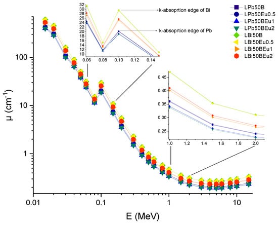 Variation of linear attenuation coefficients (μ) against photon energy for all glasses.
