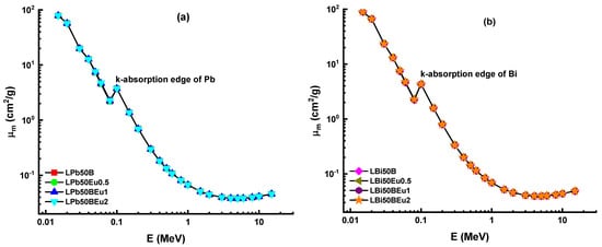 Variation of mass attenuation coefficient (μm) against photon energy for (a) LPb50BEu and (b) LBi50BEu glasses.