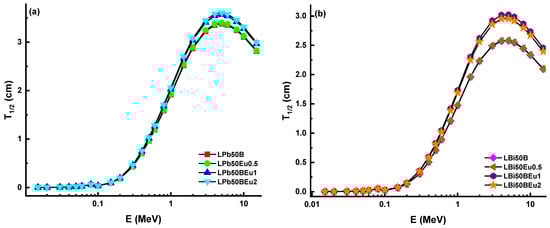 Variation of half-value layer (T1/2) against photon energy for (a) LPb50BEu and (b) LBi50BEu glasses.