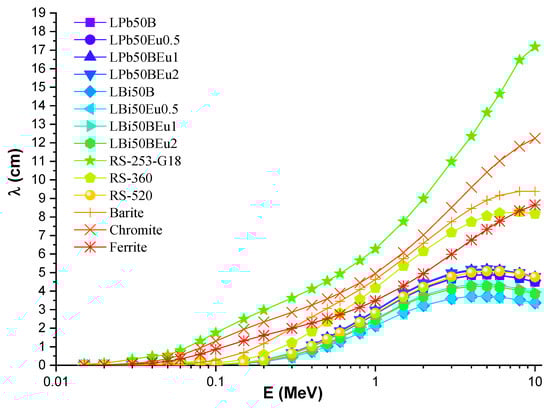 Half-value layers (T1/2) of the LPb50BEu and LBi50BEu glasses are almost zero in the 0.015–0.1 MeV range. After 0.1 MeV, secondary scattering enhances with the effect of CS, while the T1/2 values increase quickly. Beyond 3 MeV, the T1/2 values reduce with the annihilation of photons in the PP process. The densities of LPb50BEu and LBi50BEu glasses are reduced in the range of 5.39–5.04 g/cm3 and 6.81–5.94 g/cm3 with the addition of Eu2O3. Therefore, it is seen that the T1/2 values increase with the insertion of Eu2O3. The maximum T1/2 values for LPb50BEu and LBi50BEu glasses were obtained as 3.60 cm and 2.95 cm, respectively. These results are quite satisfactory for a good shield material for gamma rays. Moreover, the mean free path values (λ) of proposed glasses in comparison with some commercial SCHOTT [17] glasses, RS-253-G18, RS-360, RS-520, and concrete types, barite, ferrite, chromite [18], are given in Figure 4.
