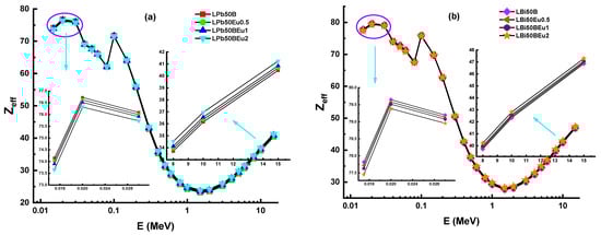 Variation of effective atomic number (Zeff) against photon energy for (a) LPb50BEu and (b) LBi50BEu glasses.