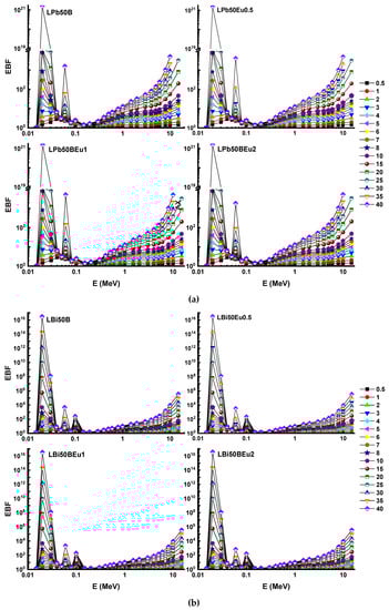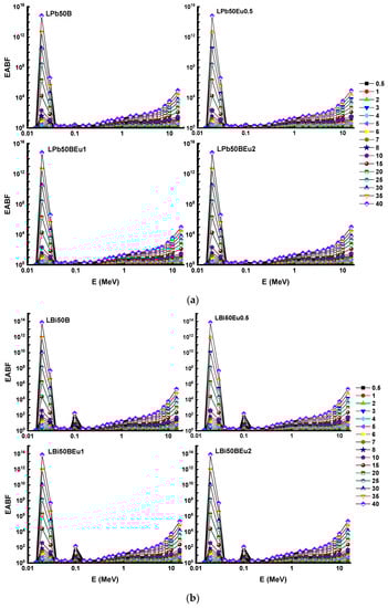 The λ values of LPb50BEu and LBi50BEu glasses are thinner than other shielding materials. The LBi50BEu2 glass had the smallest λ values, while the RS-213-G18 glass presented the largest MFP values, as seen in Figure 5. In order to express a composite material with a single atomic number, an effective atomic number (Zeff) is needed, which shows the shielding capacity of the shielding material well [19]. Figure 6 presents the change of Zeff values of L (Bi/Pb)50BEu2 glasses versus photon energy. For LPb50BEu and LBi50BEu glasses, the Zeff takes values in the range of 76.72–23.15, 75.73–23.84, and 79.64–27.71, 79.38–28.18, respectively. The largest values of Zeff are at low energies below 0.1 MeV. A few sudden peaks occur on the absorption edge of K and L shells of Pb (L:15.86 keV, K:88.00 keV) and Bi (L:16.38 keV, K: 90.52 keV), and K shell of La (38.92 keV) by the effect of PEA. Between 0.1–1 MeV, the Zeff values rapidly decrease and, beyond 1 MeV, the Zeff values increased due to the Z2-dependent change of the PP cross section. While the addition of Eu2O3 in the high energy region increased the Zeff values of the glasses, the Zeff values declined at medium and low energy levels. It is noted from Figure 6 that the Zeff values of LBi50BEu glasses prepared with Bi2O3 are higher than LPb50BEu glasses. Perfect geometry is not possible in real radiation applications. For this reason, the correction factor B (build-up factor) is needed to account for scattering in the material and in the air in the Lambert–Beer law [20]. Energy absorption and exposure build-up factors (EABF and EBF) for L(Pb/Bi)50BEu glasses were generated using Phy-X/PSD software in photon energies of 0.015–15 MeV for several λ values.