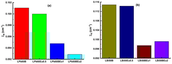 Effective removal cross-sections for fast neutrons (ΣR) for (a) LPb50BEu and (b) LBi50BEu glasses.