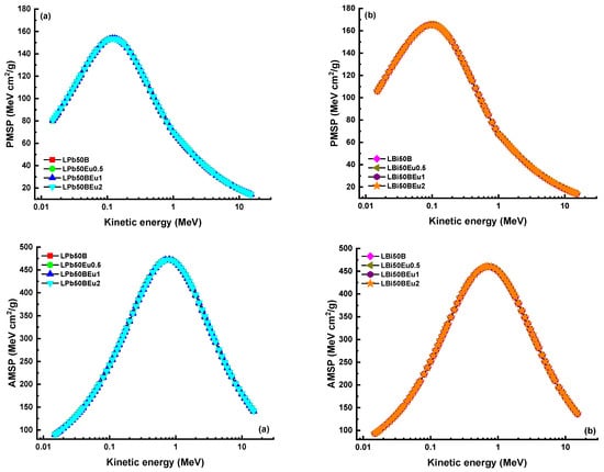 Proton (PMSP) and alpha (AMSP) mass stopping as a function of kinetic energy for (a) LPb50BEu and (b) LBi50BEu glasses.