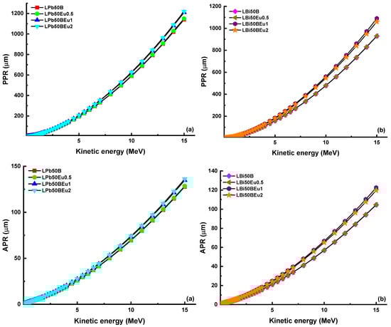 Proton (PPR) and alpha (APR) projected range as a function of kinetic energy for (a) LPb50BEu and (b) LBi50BEu glasses.