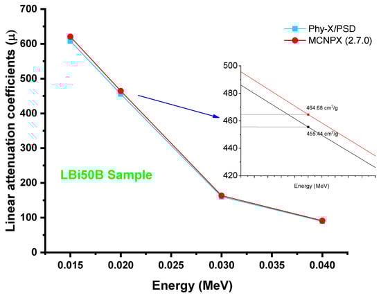 Finally, it is worth noting that the linear attenuation coefficients determined using Phy-X/PSD and MCNPX (2.7.0) were very consistent. Figure 12 depicts a comparison of obtained linear attenuation coefficients from MCNPX Monte Carlo code and Phy-X/PSD for the LBi50B sample. A relative difference of 2% was reported at 0.02 MeV photon energy. Overall, our findings showed that relative differences were varied from 1.15% to 2.6% at all photon energies. Both outcomes were reported in comparable linear attenuation coefficient values, based on our results. However, minor variations in certain energy areas were discovered. This is closely linked to the tools employed, since MCNPX is a Monte-Carlo-based technique for radiation transport that needs user specification at different stages of the process described before. By contrast, Phy-X/PSD is a web-based tool that requires just the material composition, density, and energy quantities. As a result, some differences are almost certainly due to a variety of variables, including the number of dispersed gamma rays entering the detecting field, the narrow beam shape, the cross-section libraries and physics lists, the hardware performance, and the CPU characteristics of the computers used.